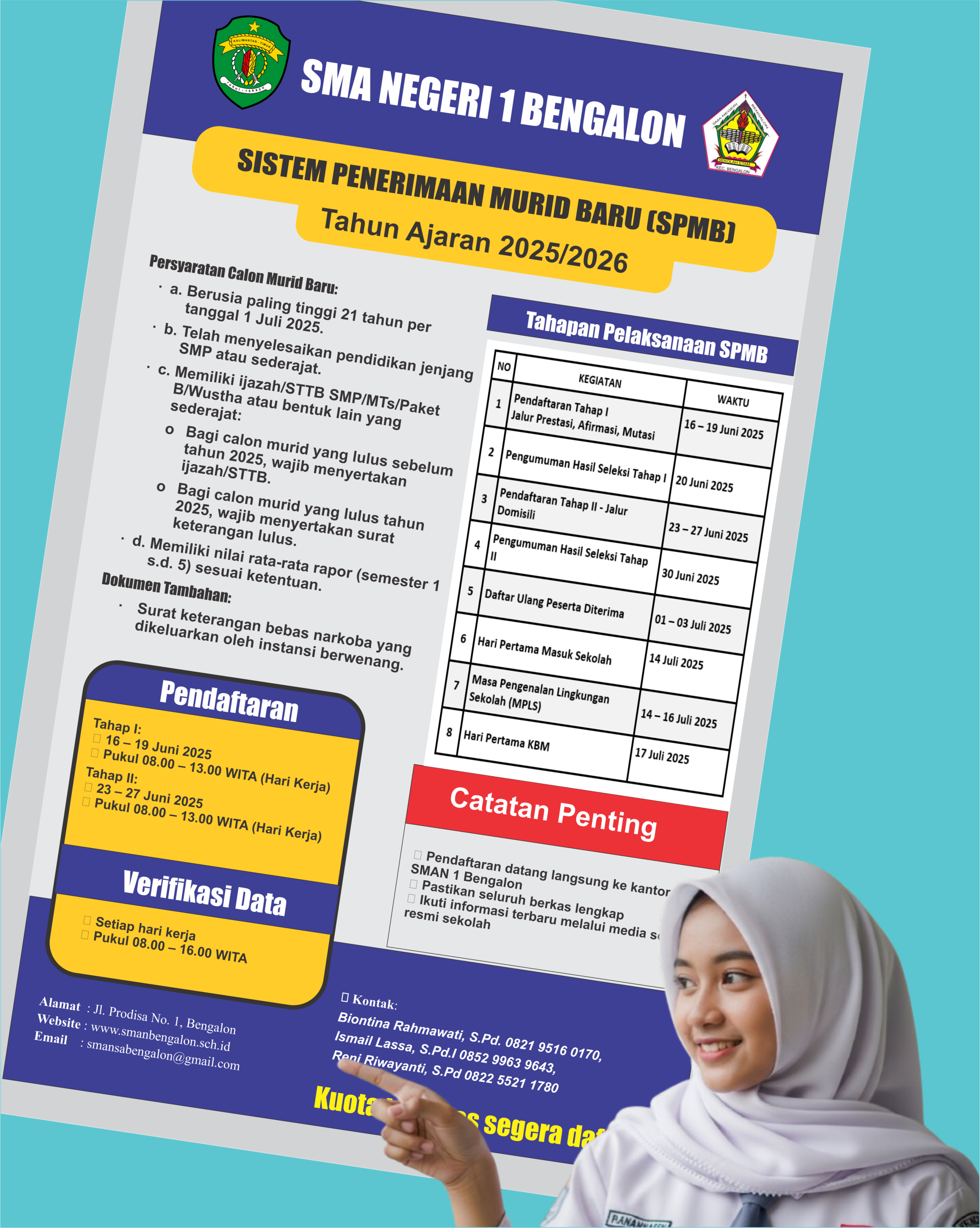 • SPMB 2025 SMAN 1 Bengalon - Tahap I :16 - 19 Juni 2025 ( jalur Prestasi, Afirmasi dan Mutasi), Tahap II: 23 - 27 Juni 2025 (Jalur Domisili)